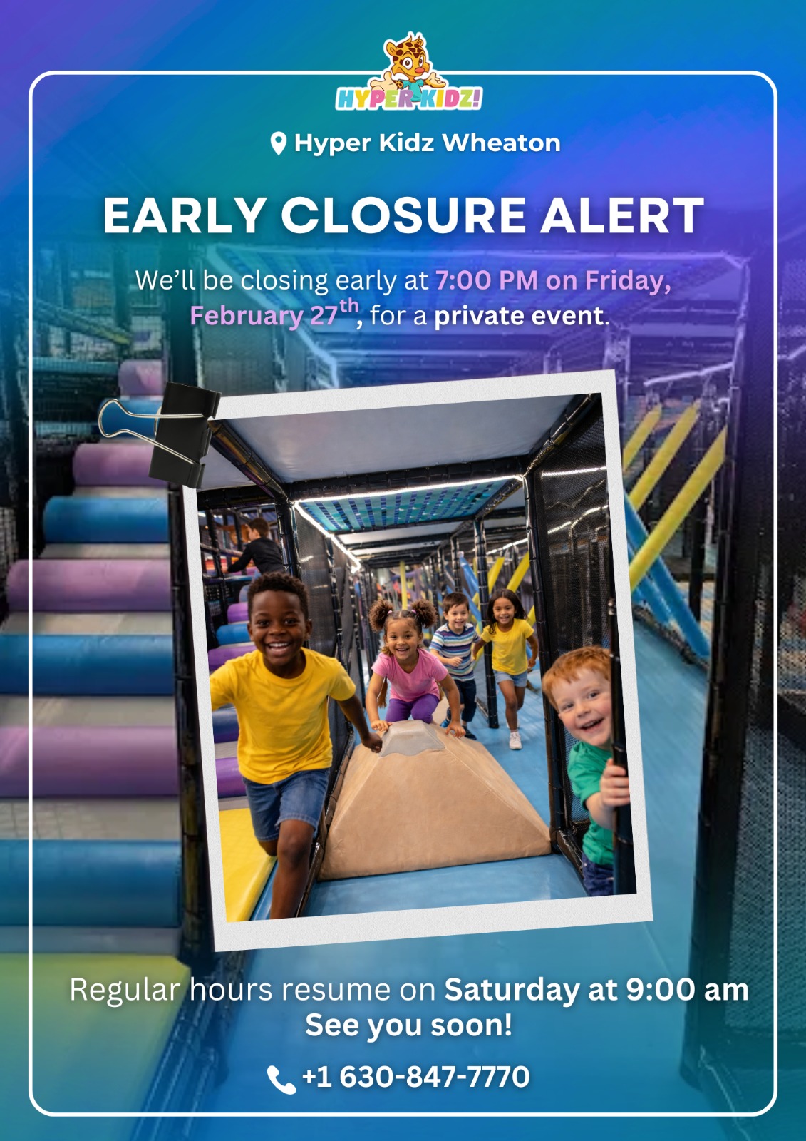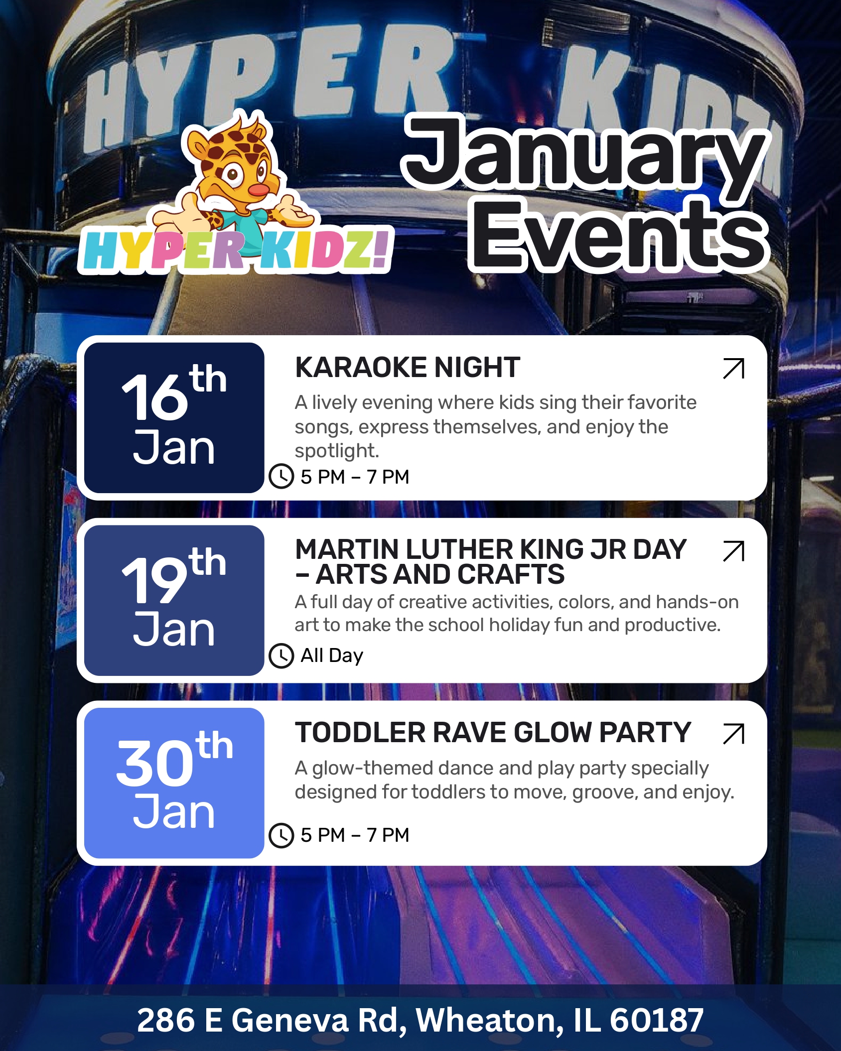 Play is the work of the child and is beneficial to their mind and body. Hyper Kidz offers a unique indoor playground for children to explore with a fun theme, plenty of fun attractions, and play zones that are safe and designed for different developmental age groups. Our 27,000 sq ft indoor playground is the perfect place to bring your child for open play or to host their next birthday party! We offer unlimited play 7 days a week for children ages 0-13. Come play with us!